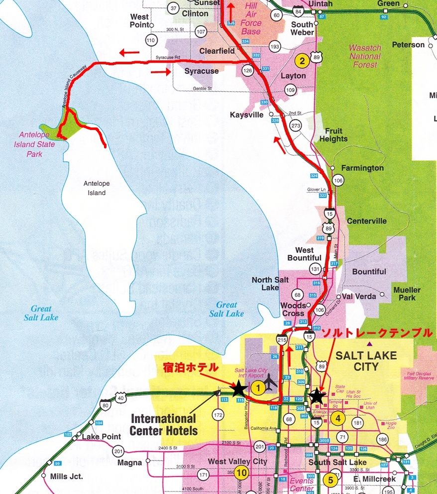 サンフランシスコに到着後、1時間半待ちの接続便でソルトレイクシティーへ乗り継ぎました。成田からの所要時間は13時間30分で、現地には同日2日の午後4時に到着しました。(日本との時差が16時間)