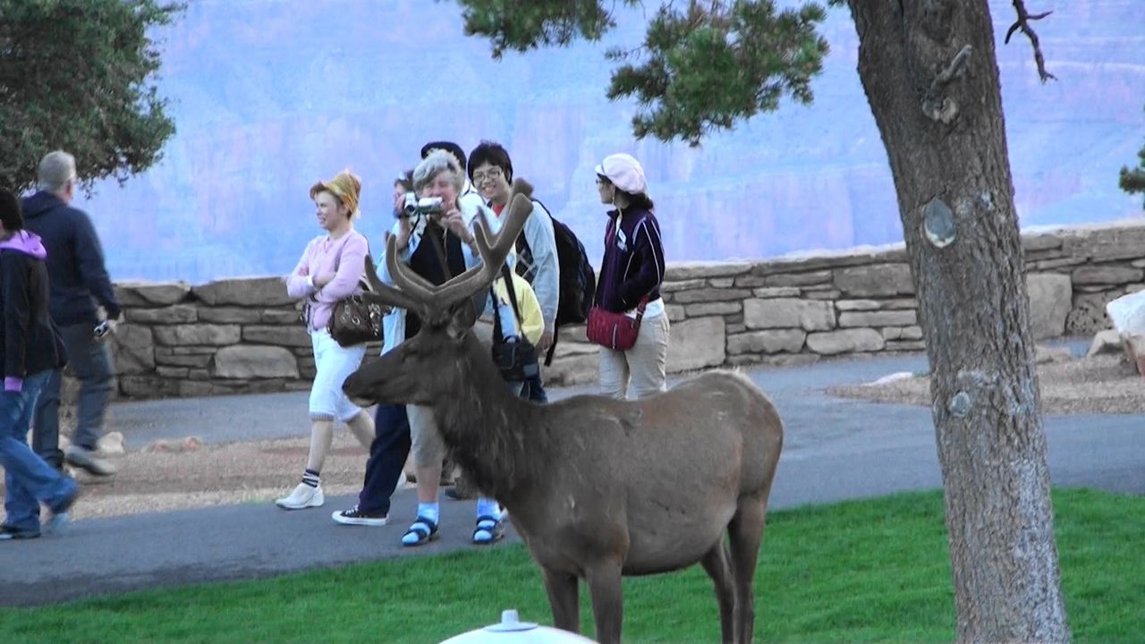 グランドキャニオン3日目の朝6時半です。ロッジの窓の外には早朝散歩の観光客に交じってエルクが出没しています。