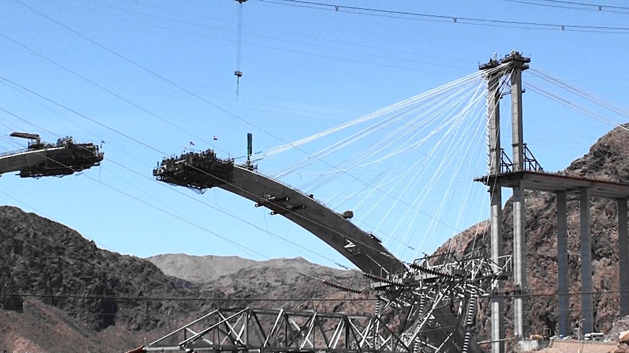 ダム近くのパーキング場に車を進め、堤防の上を歩いてみることにしました。堤防を歩き始めて最初に目に入って来るのはフーバーダム巨大バイパス・ブリッジの工事中の光景です。